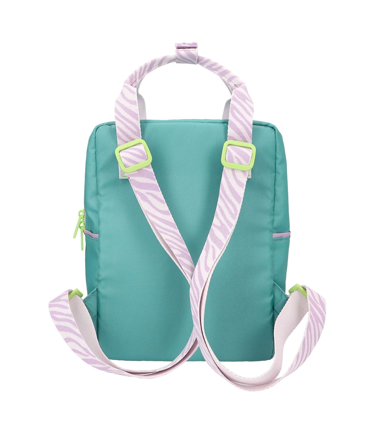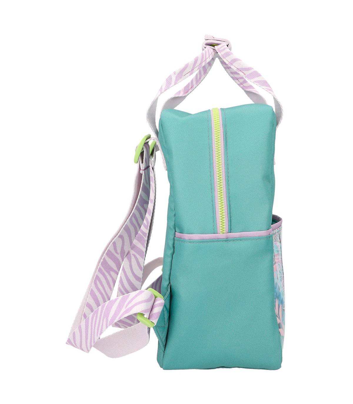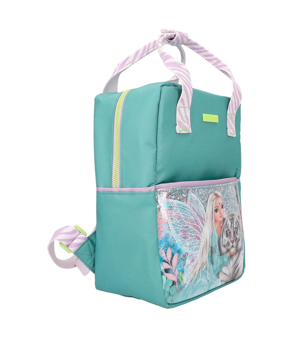 Esta mochila pequeña de TOPModel destaca por su precioso colorido en tonos petróleo y lavanda con detalles en alegre color verde lima. En la cara delantera lleva una modelo de TOPModel y un tigre como motivos principales sobre fondo de purpurina. Los tirantes, con estampado atigrado, son ajustables y las asas pueden fijarse entre sí gracias a un pequeño botón de presión. La mochila lleva en su interior un práctico mosquetón para enganchar las llaves de forma segura. Material: poliéster 100 por 100; parte delantera de cloruro de polivinilo 100 por 100; interior de poliéster 100 por 100.
