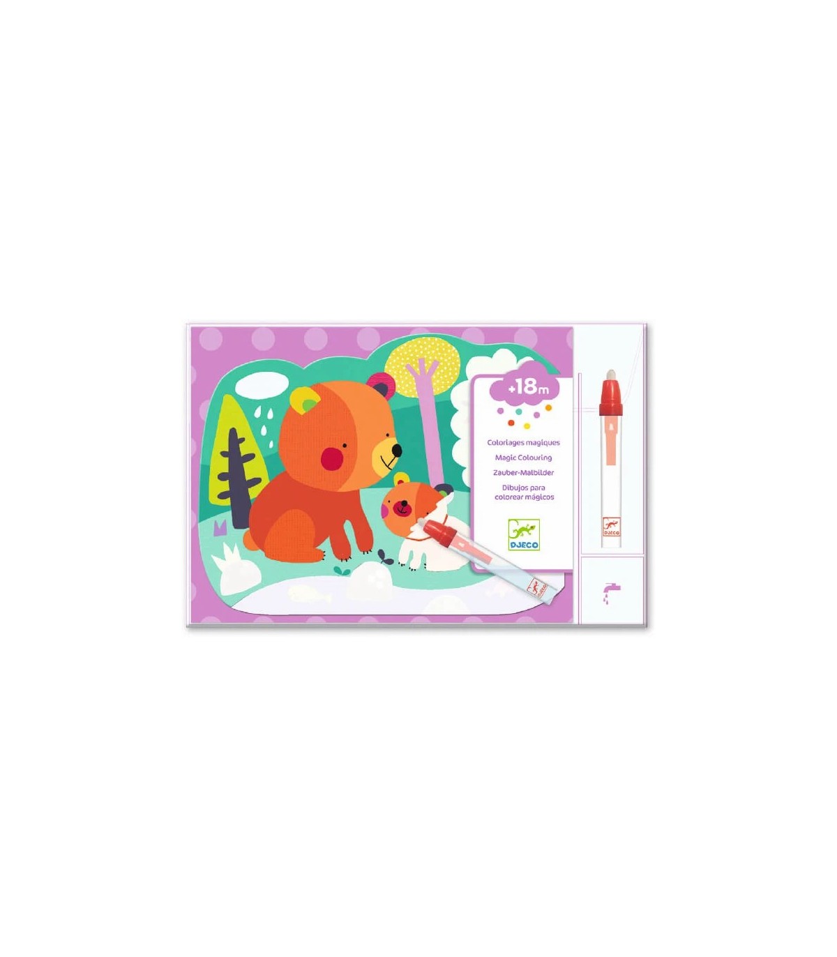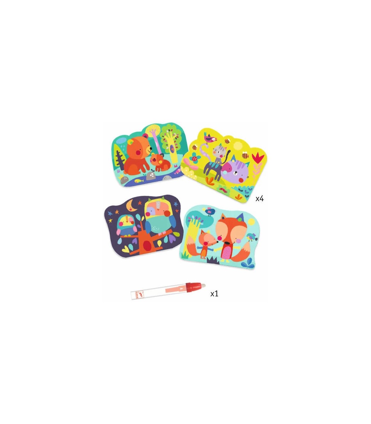 Un pack de acuarelas adecuado para niños a partir de 18 meses. El niño colorea las partes blancas con el lápiz de agua para descubrir lo que se esconde en el cielo. Es mágico: los dibujos aparecen y cambian de color. Las tablas se secan y el niño vuelve a empezar.
