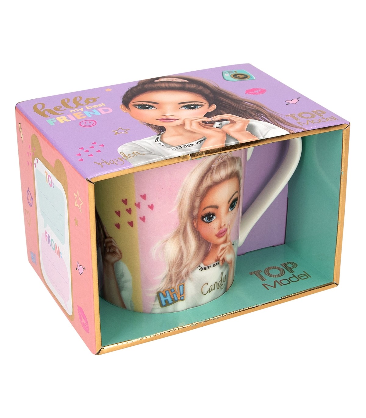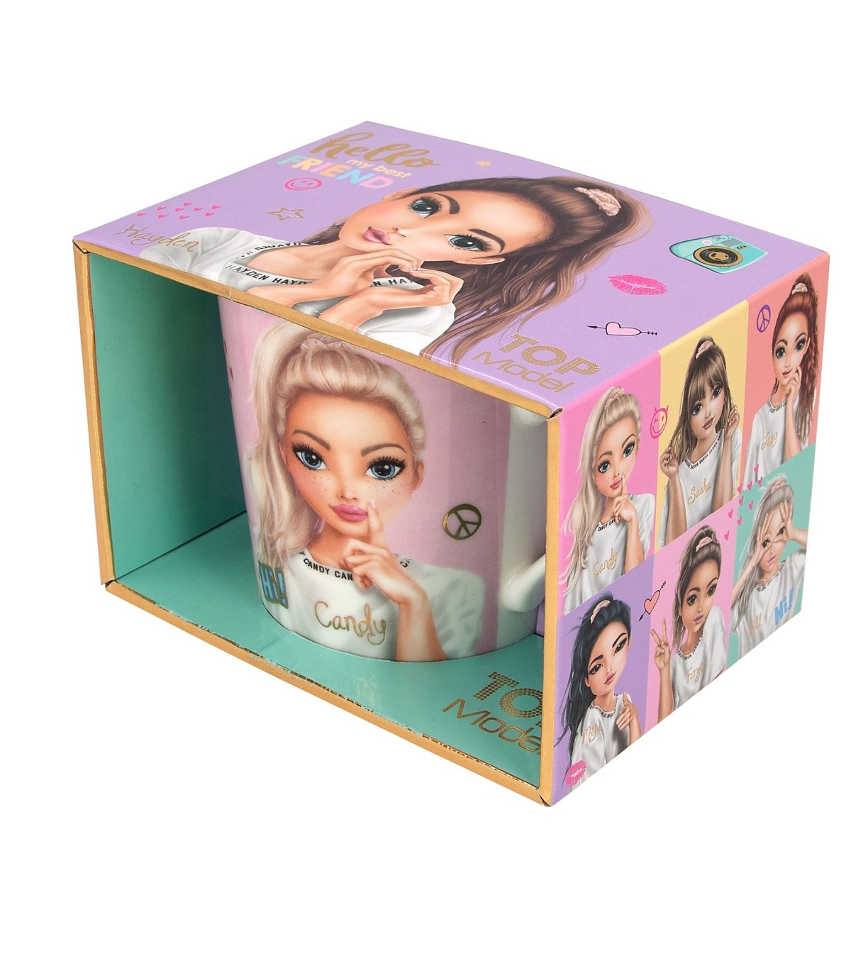 La taza de la colección Snap Shots de TOPModel es de alegres colores y lleva impresas tres modelos guapísimas y detalles en oro de gran calidad. Su capacidad es de 300 ml y se vende presentada en una preciosa caja de regalo. La taza no es apta para lavavajillas ni para microondas debido a los adornos dorados.