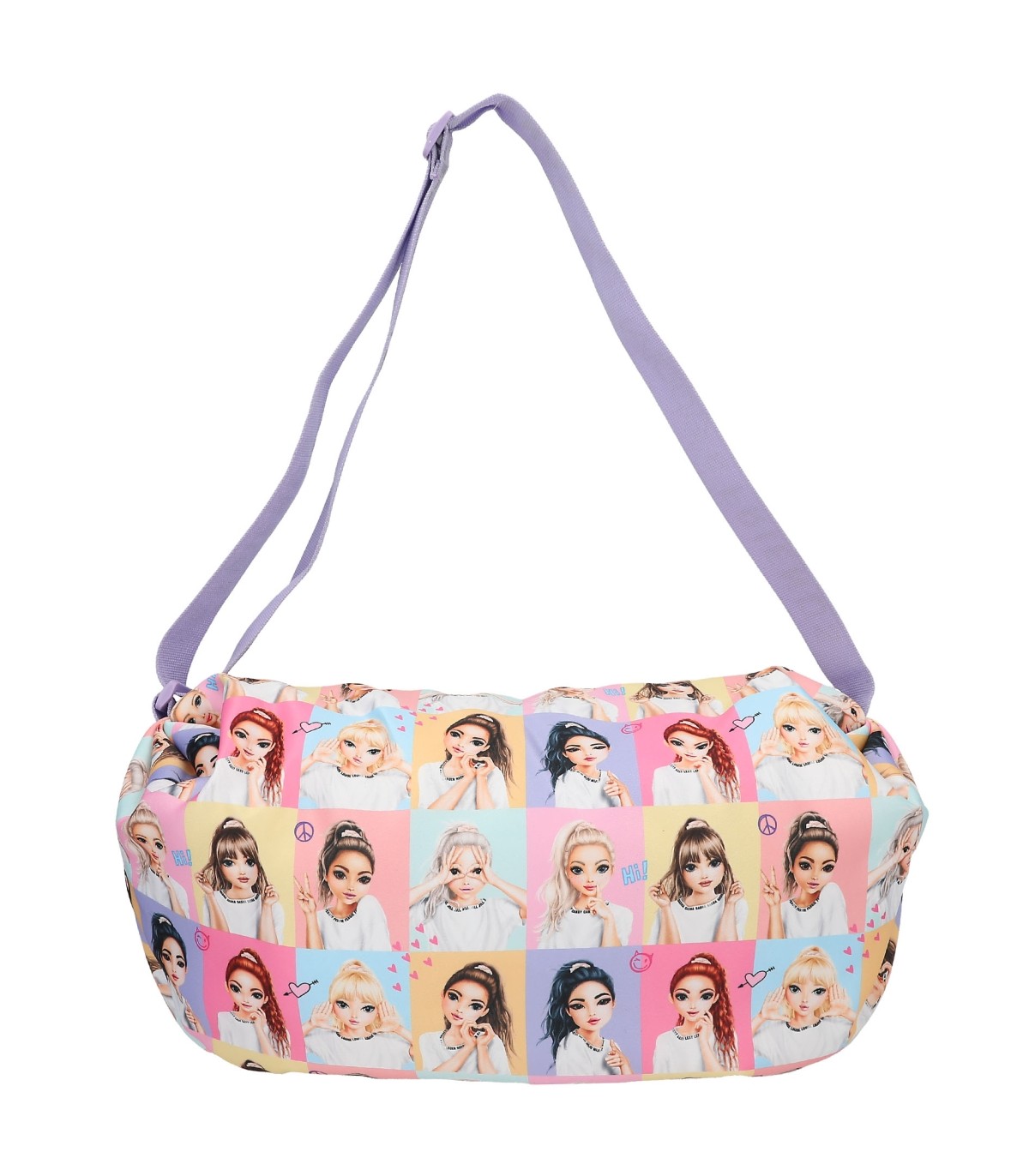 La bolsa de TOPModel Snap Shots puede llevarse tanto cruzada como al hombro. Está totalmente estampada con imágenes de modelos. La bandolera lila ajustable lleva un lema escrito con letras reflectantes.
