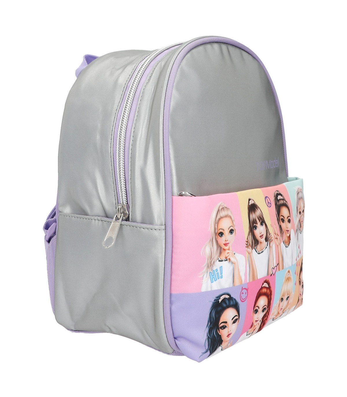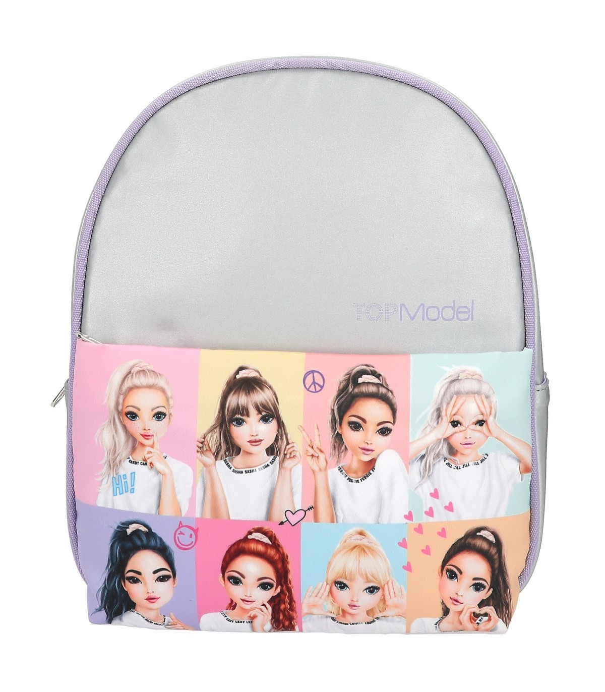 La mochila pequeña de TOPModel Snap Shots lleva imágenes de modelos con mucho colorido en la cara delantera. El resto de la mochila es de material reflectante. Con tirantes ajustables con lema escrito con letras también reflectantes y un asa para que resulte más manejable.