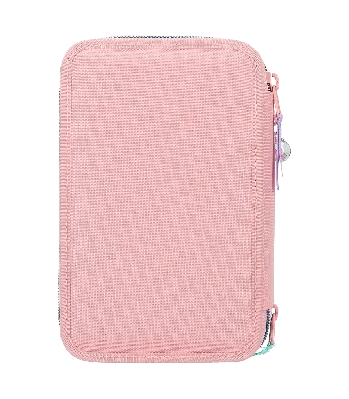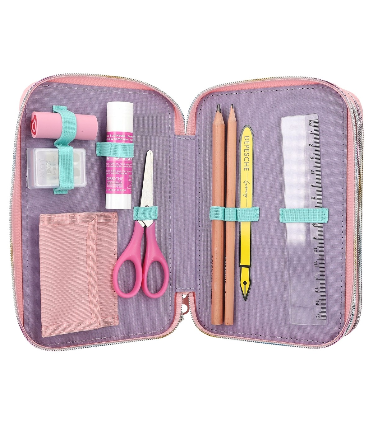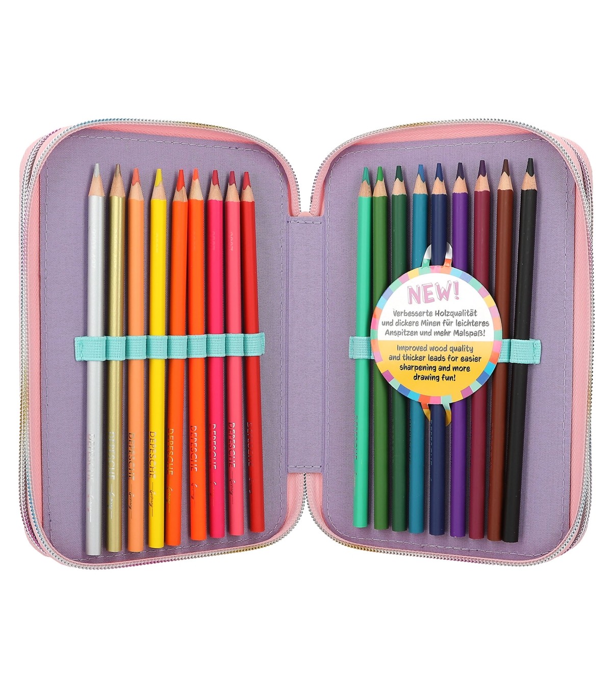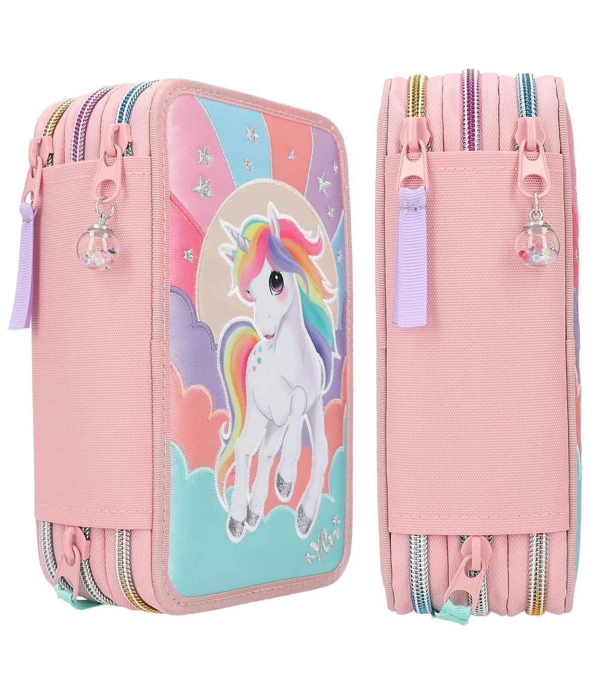 Para las verdaderas fans de los unicornios. El estuche de Ylvi lleva en la cara delantera la imagen de un unicornio tamaño grande sobre un fondo en imitación de un collage hecho de raso pespunteado de preciosos tonos turquesa, rosa y lila. Plus monísimo: la bola brillante que cuelga de la cremallera. Los tres compartimentos separados se venden llenos del siguiente material: 18 lápices de colores, 18 rotuladores, 2 lápices, sacapuntas, regla, tijeras, pegamento en barra e incluso lleva un pequeño bolsillo con cierre de velcro.