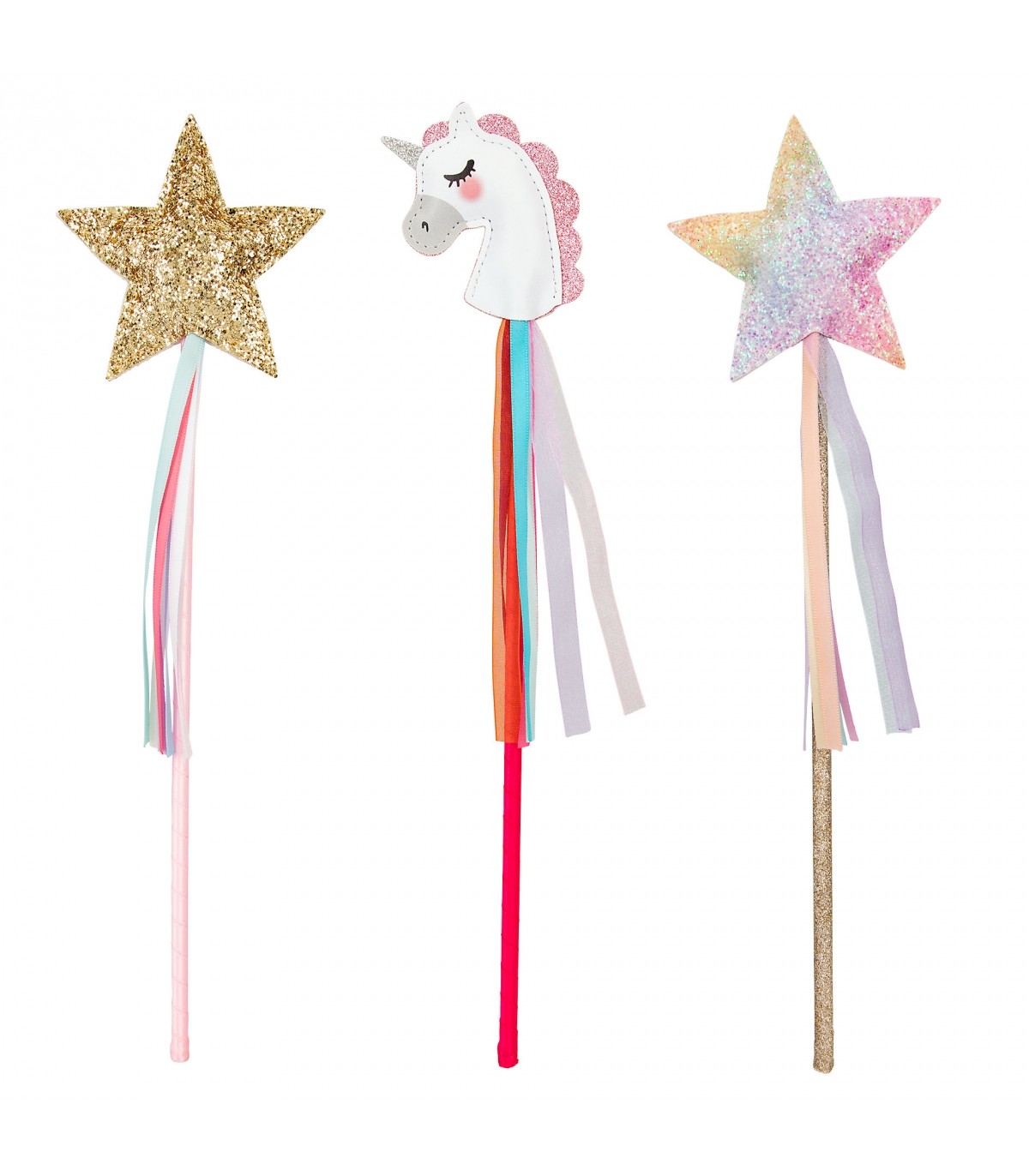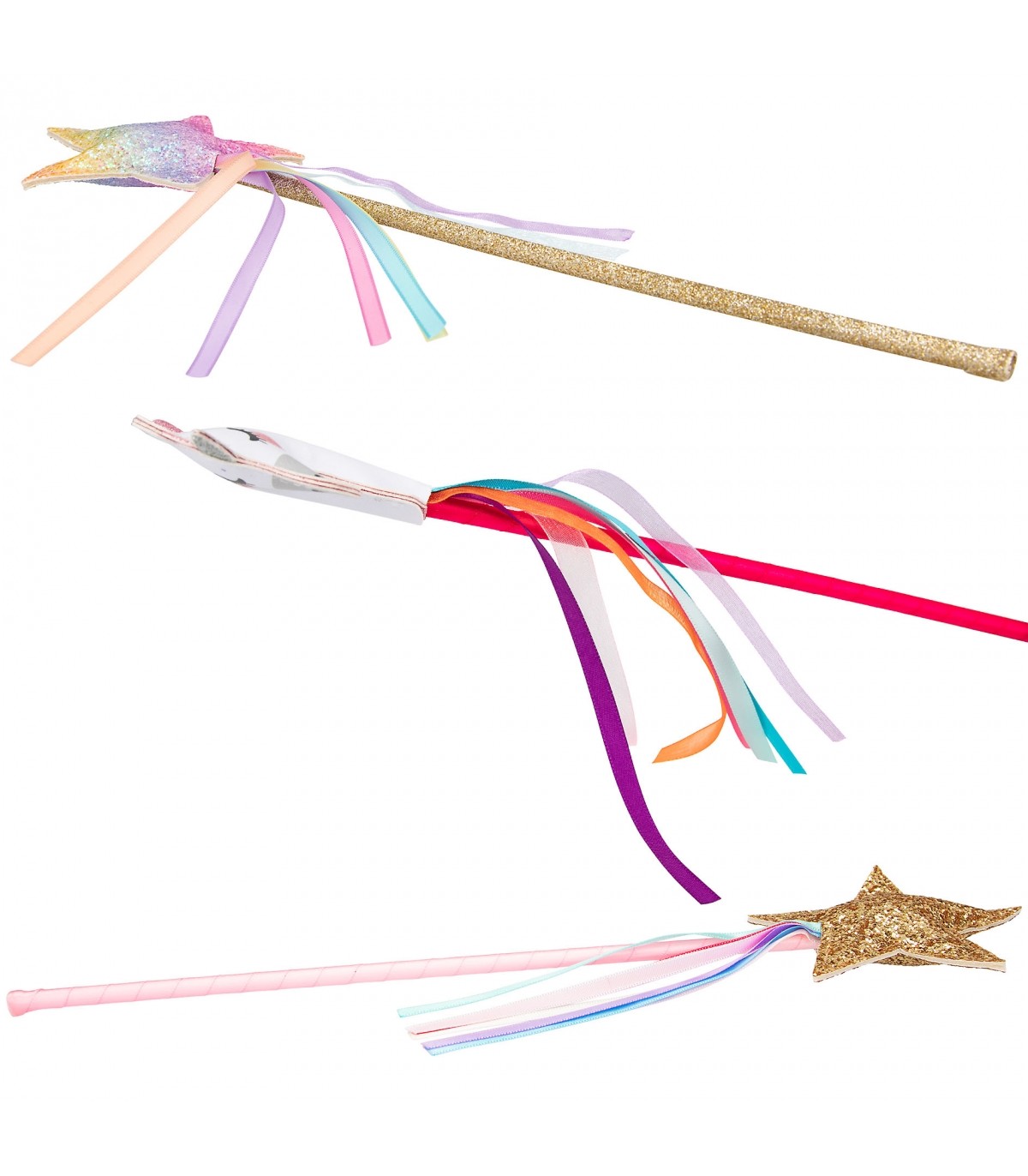 Para hacer magia maravillosa con Princess Mimi. Las varitas mágicas tienen como remate un topper precioso. Además, la propia varita está envuelta con cinta de raso y al agitarla se mueven muchas cintas de colores. Disponibles tres diseños diferentes: estrella dorada brillante con varita rosa, estrella brillante de varios colores con varita dorada brillante y Bonny Pony con varita rosa intenso.