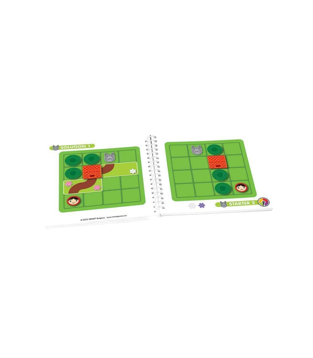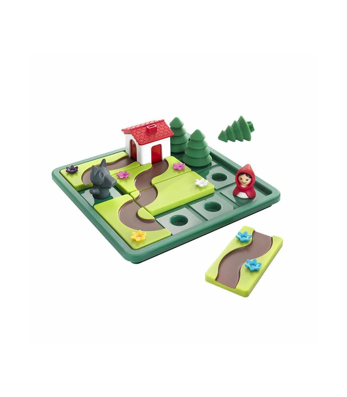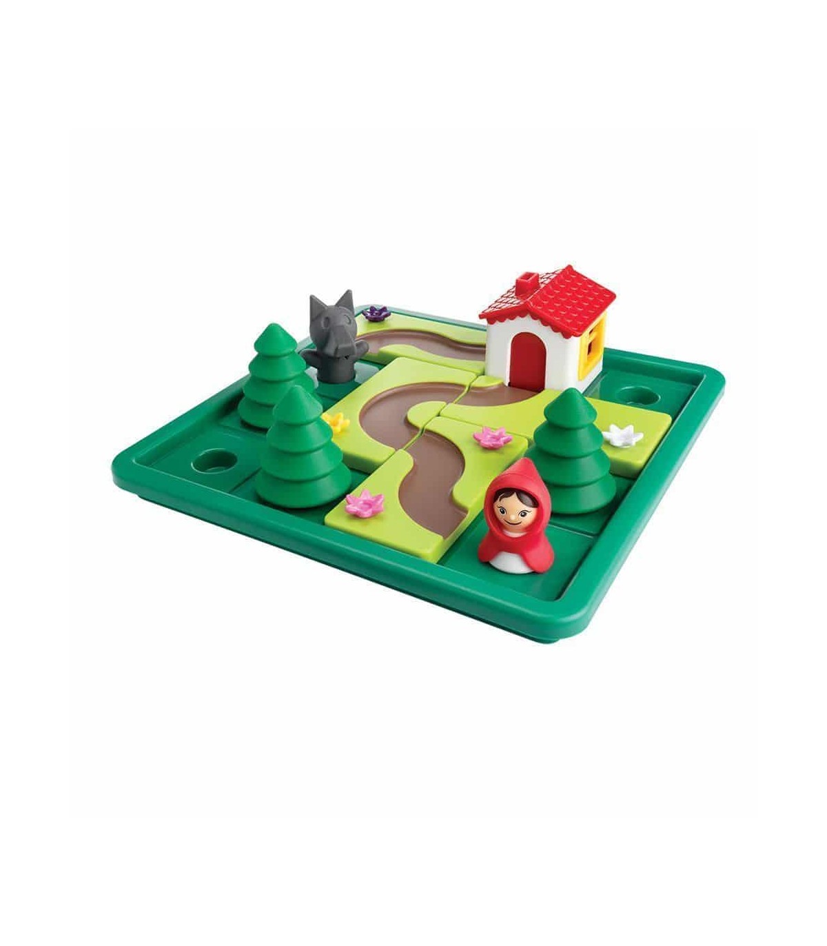 ¿Puedes ayudar a Caperucita Roja a encontrar el camino correcto a la Casa de la Abuelita antes de que llegue el Lobo? Caperucita Roja es un juego de ingenio perfecto para niños pequeños, ya que consiste en 5 piezas grandes y fáciles de manipular con caminos y flores. Los niños quedan fascinados al poder mover las figura por el tablero. El juego incluye un libro con el cuento en imágenes y un cuaderno con 48 retos (24 con el lobo y 24 sin él).
