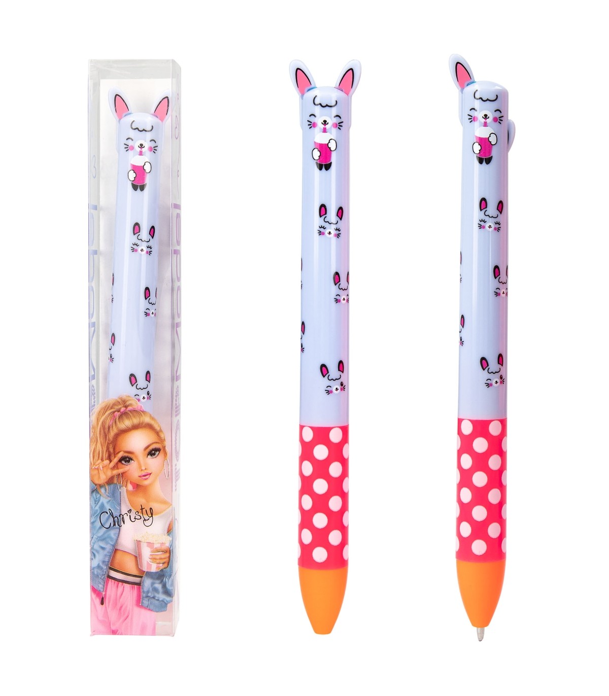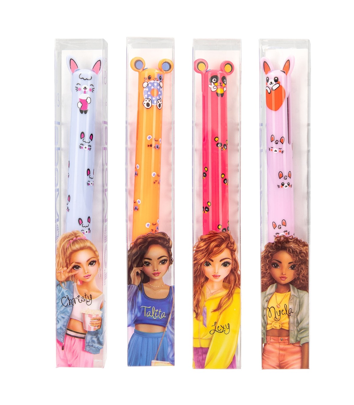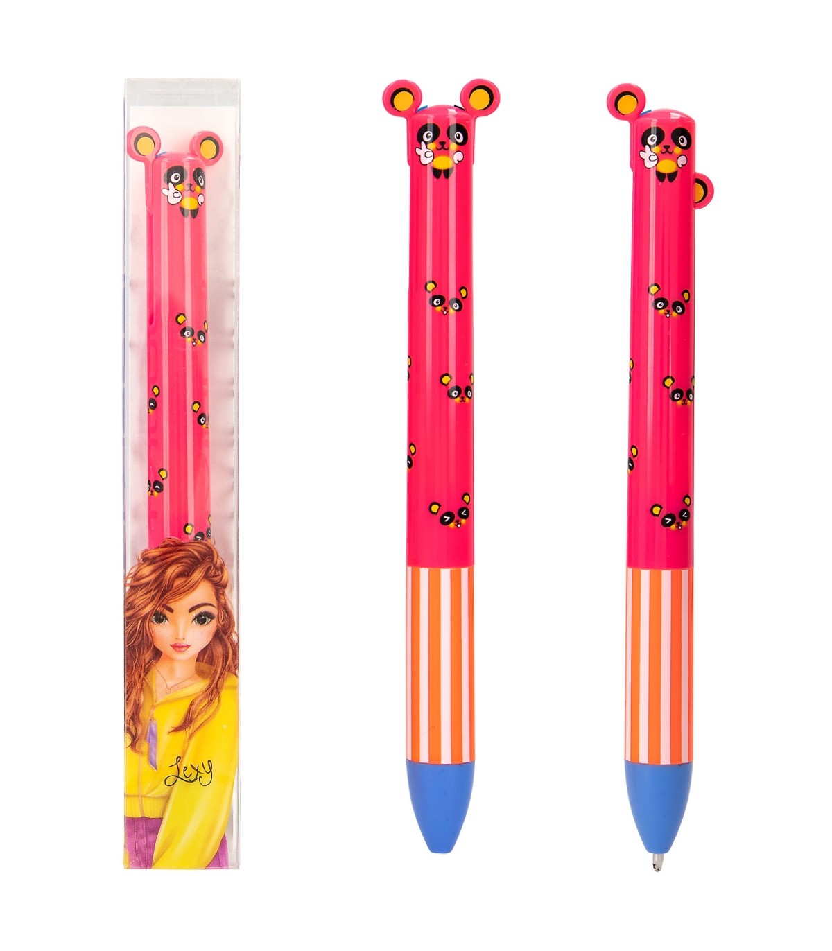 Un bolígrafo, 2 minas. El presionar hacia abajo la orejita correspondiente, el boli escribirá en azul o negro o bien en azul o lila. Disponible en cuatro diseños de animalitos de TOPModel monísimos: dos ositos y dos conejitos.