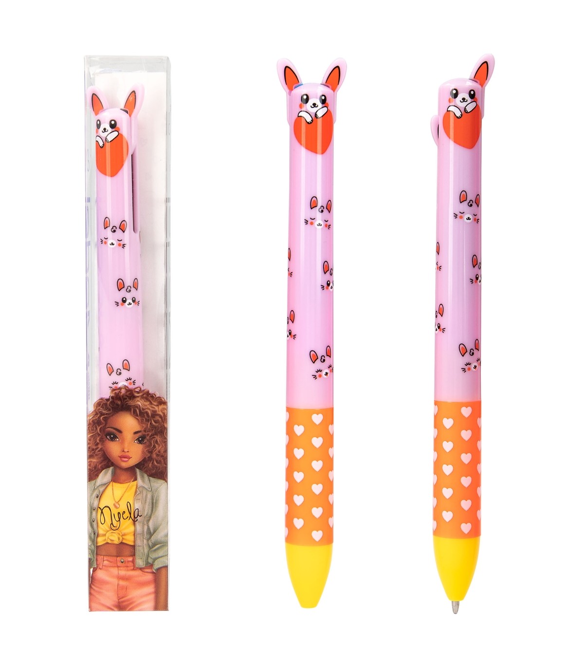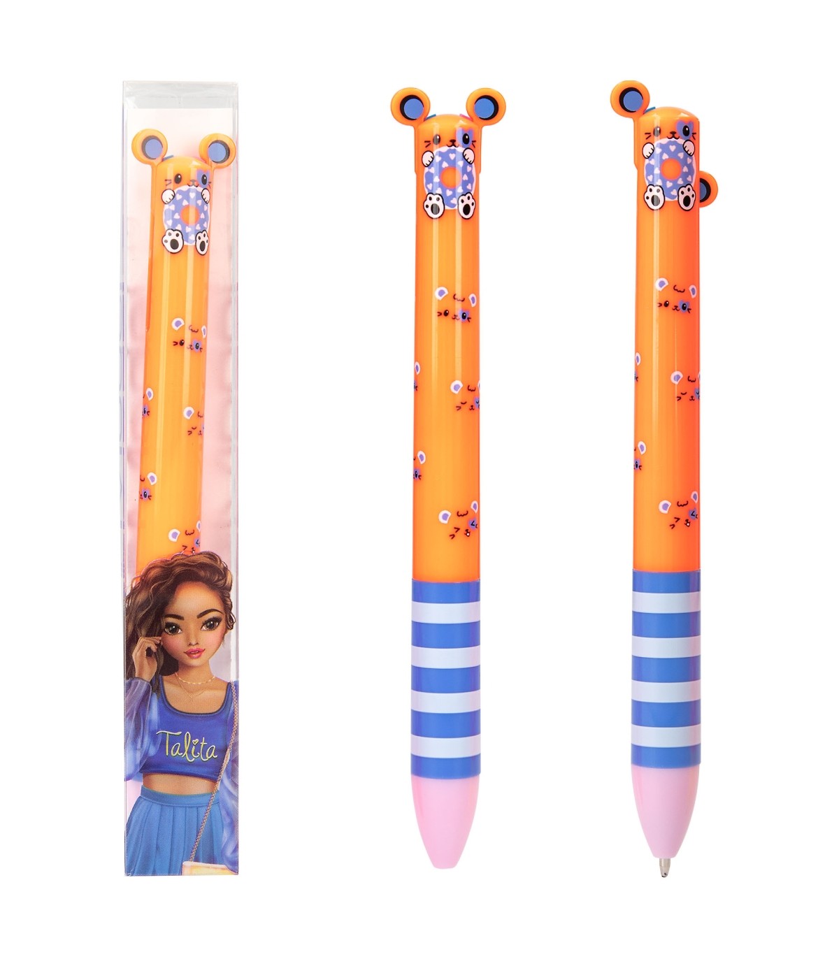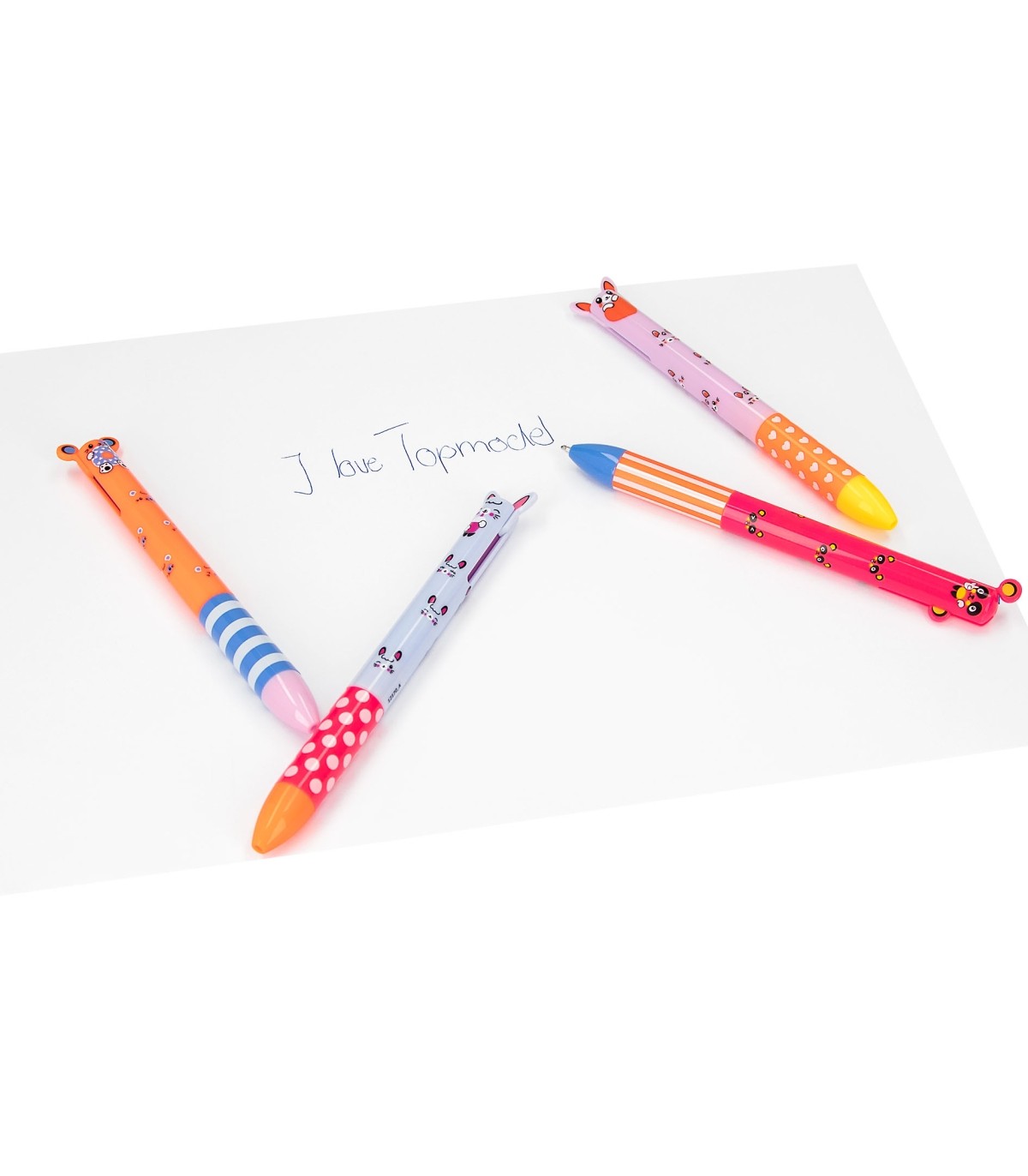 Un bolígrafo, 2 minas. El presionar hacia abajo la orejita correspondiente, el boli escribirá en azul o negro o bien en azul o lila. Disponible en cuatro diseños de animalitos de TOPModel monísimos: dos ositos y dos conejitos.