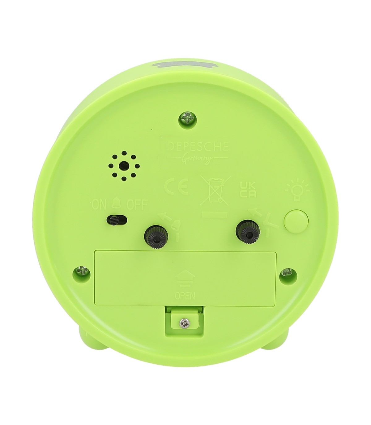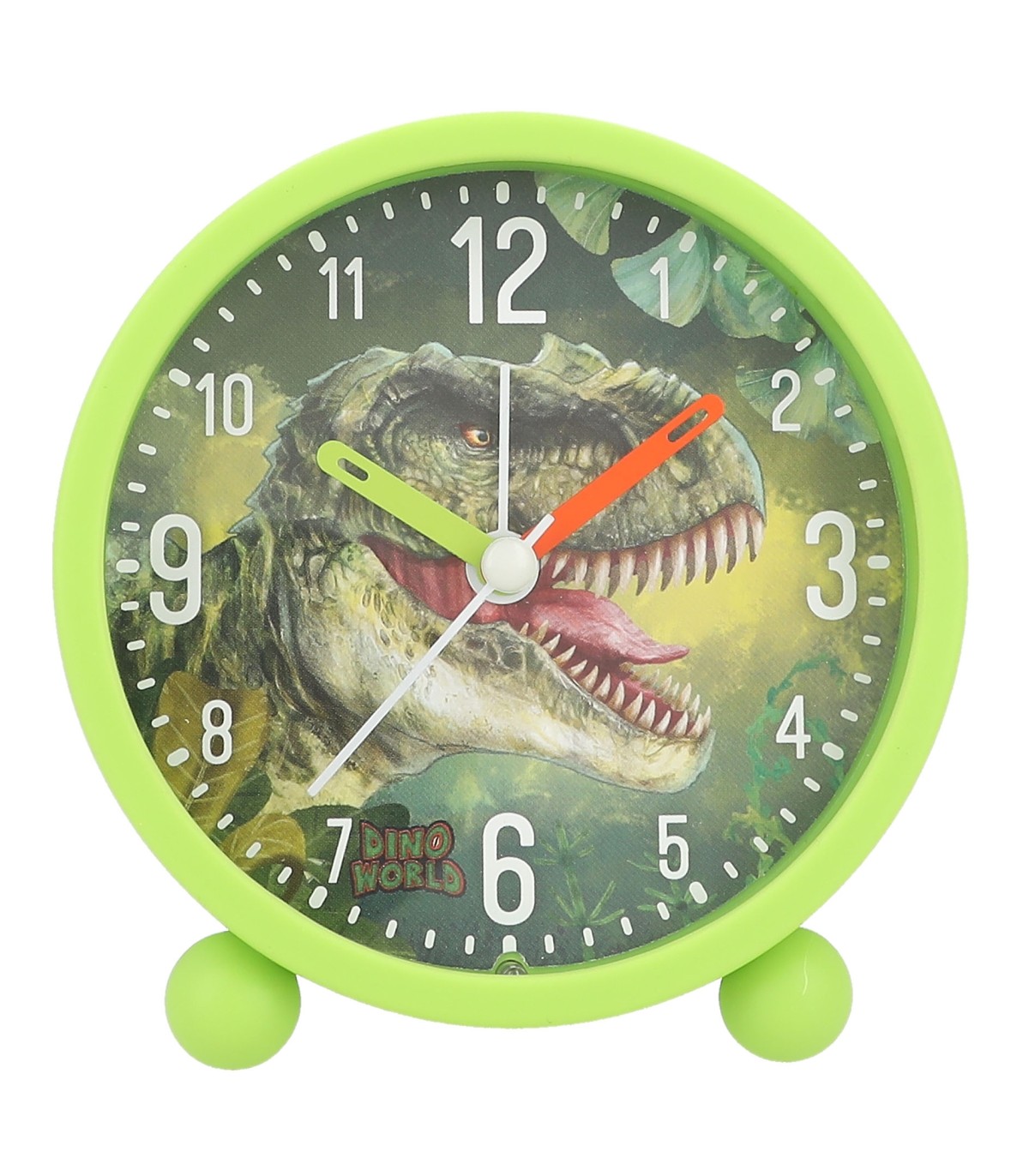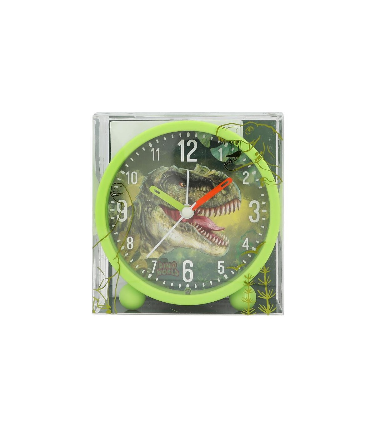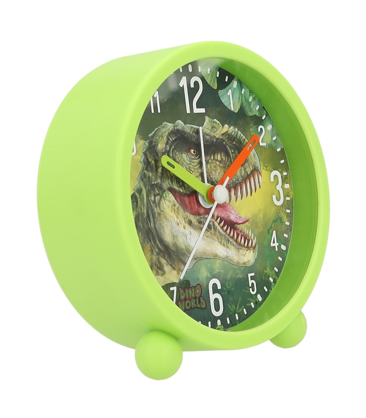 ¡Es la hora de los dinosaurios! Este despertador redondo de color verde, con un motivo chulísimo de un tiranosaurio rex en la esfera, es totalmente silencioso y resulta muy práctico porque puede iluminarse en la oscuridad (apretando el botón correspondiente). Pila recambiable incluida (1 x AA 1,5V).