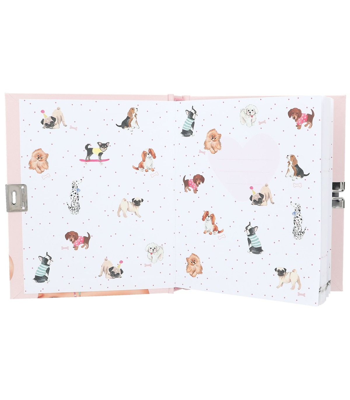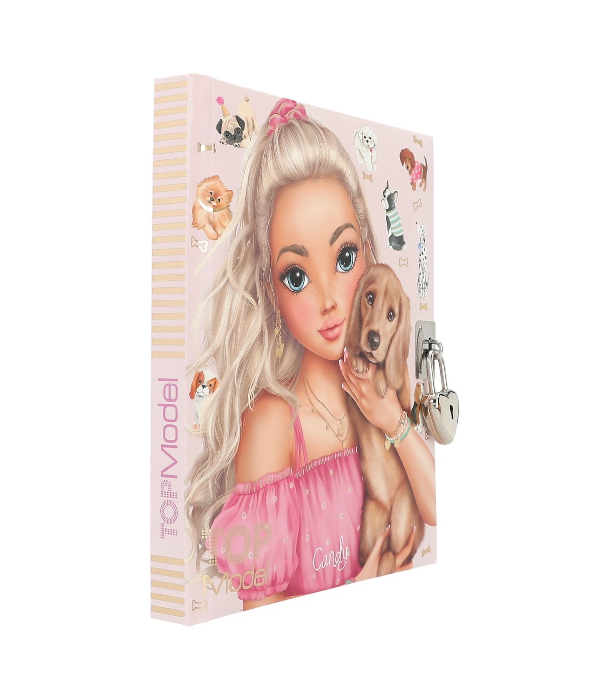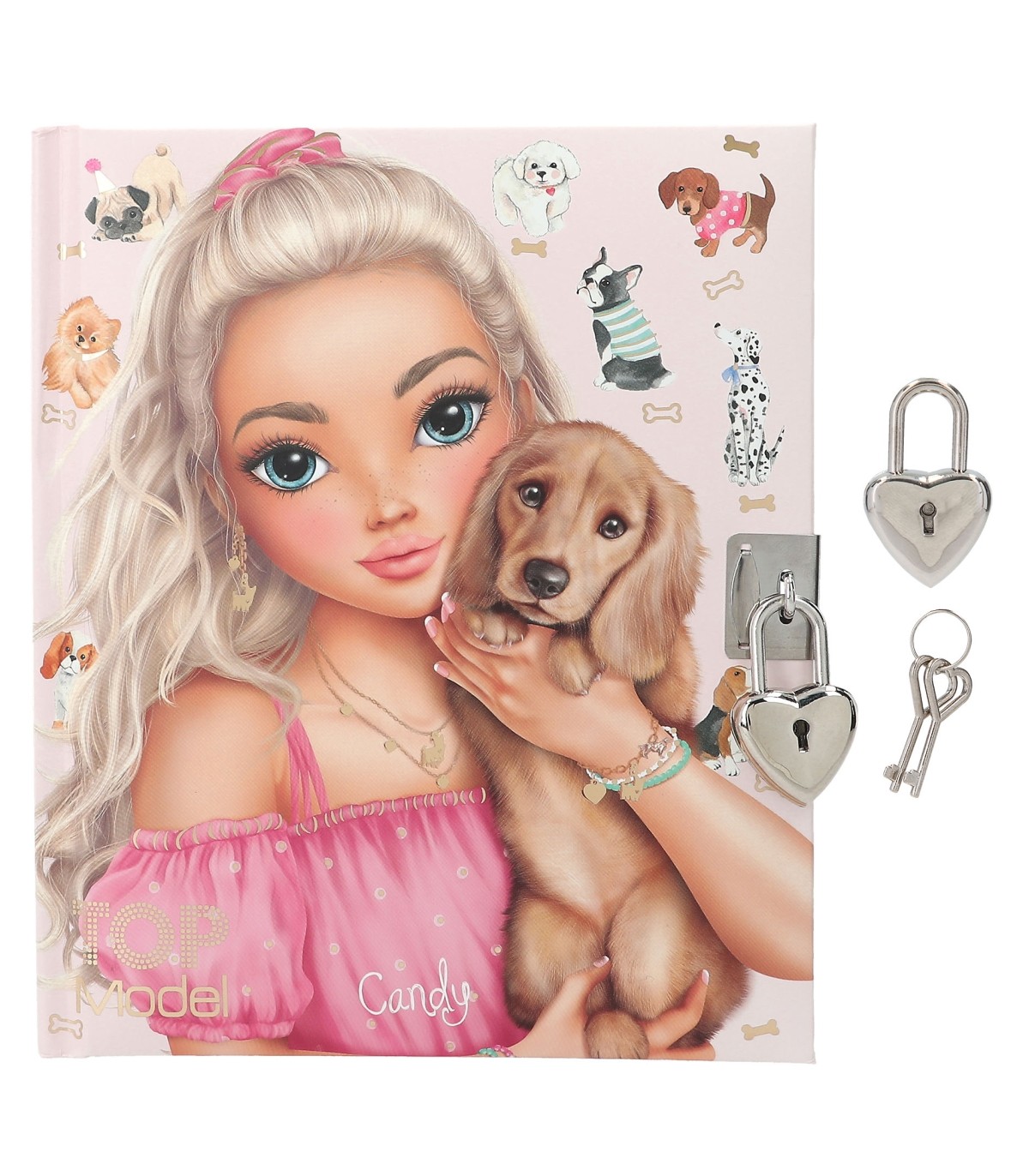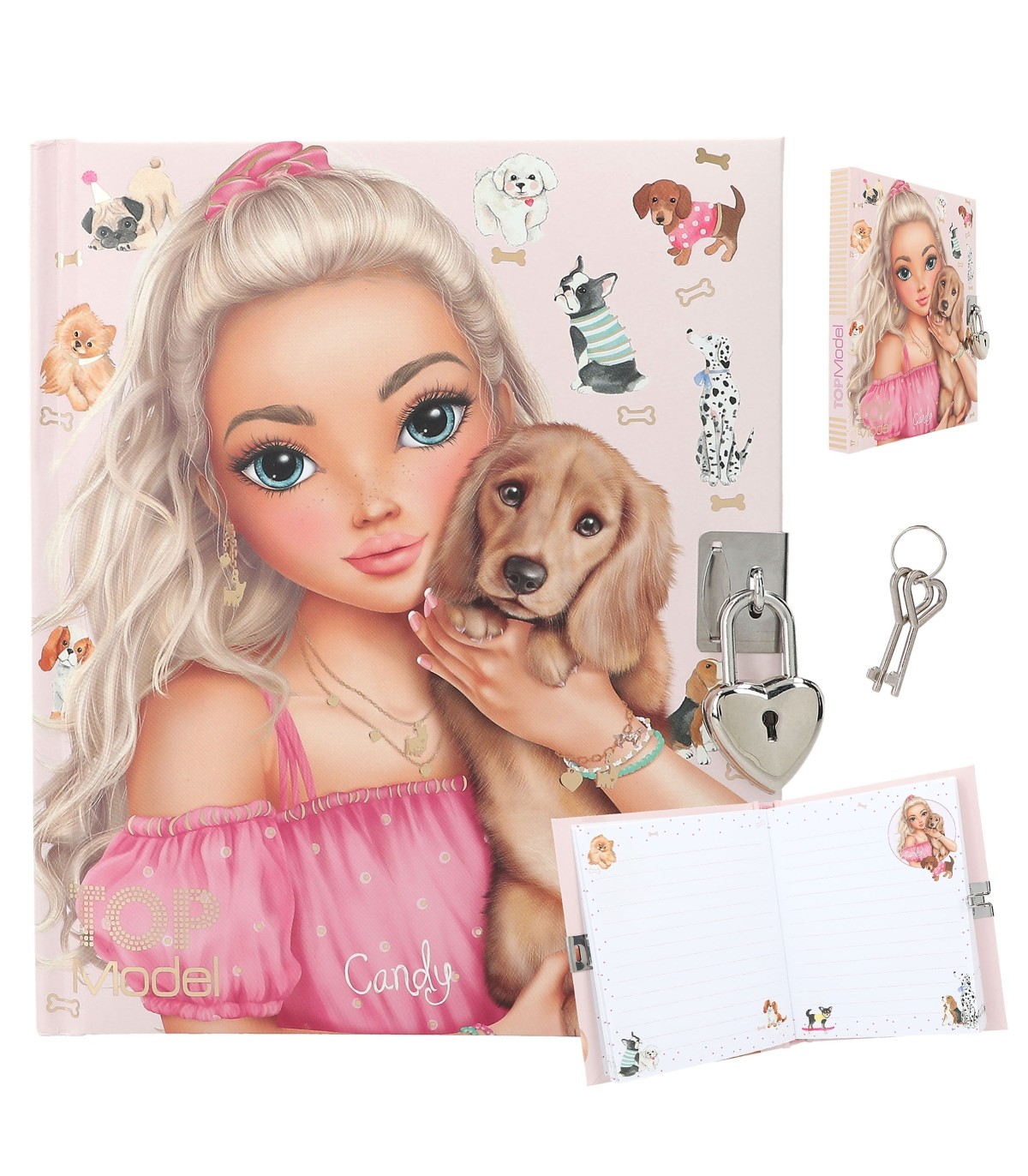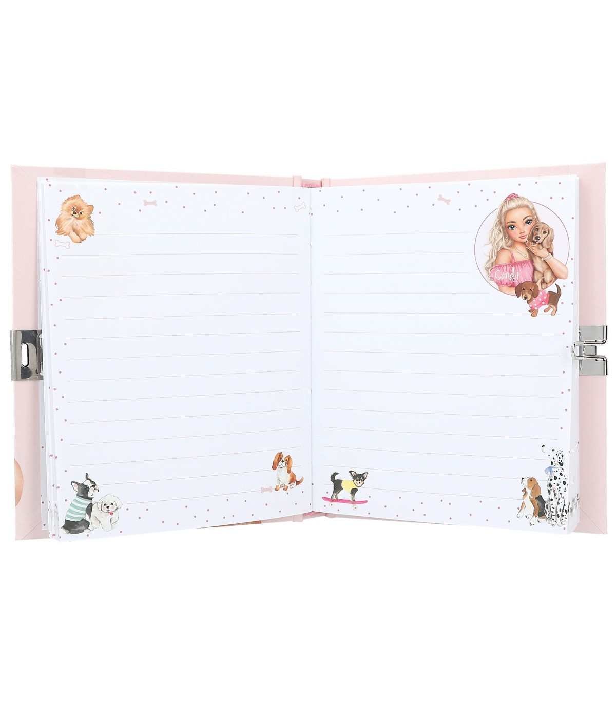 Para secretos y deseos. El diario de TOPModel Doggy, con candado de corazón, diseño de una modelo y muchos perritos monísimos, tiene 192 páginas con pauta de línea fina y preciosas ilustraciones de perros.