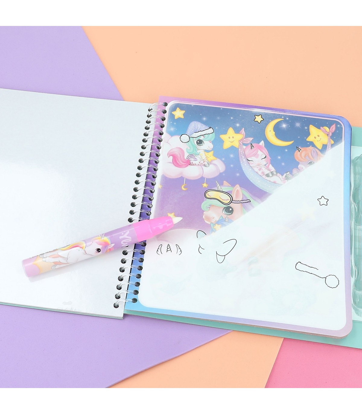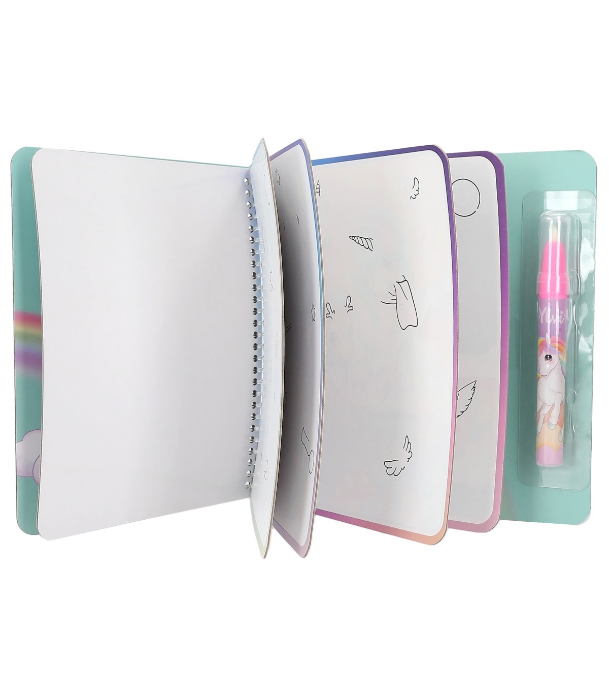 Dibujar de forma mágica. En el Aqua Magic Book de Ylvi aparecen imágenes maravillosas como por arte de magia al dibujar con el rotulador rellenable de agua sobre las páginas en blanco. Al secarse el papel vuelven a desaparecer los dibujos. Las cinco páginas encuadernadas con gusanillo son de cartón grueso y resistente para evitar que se reblandezcan.