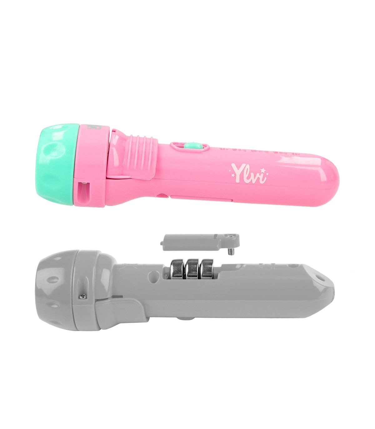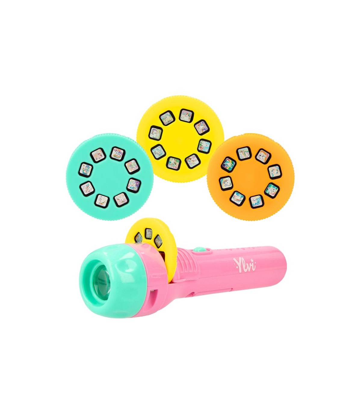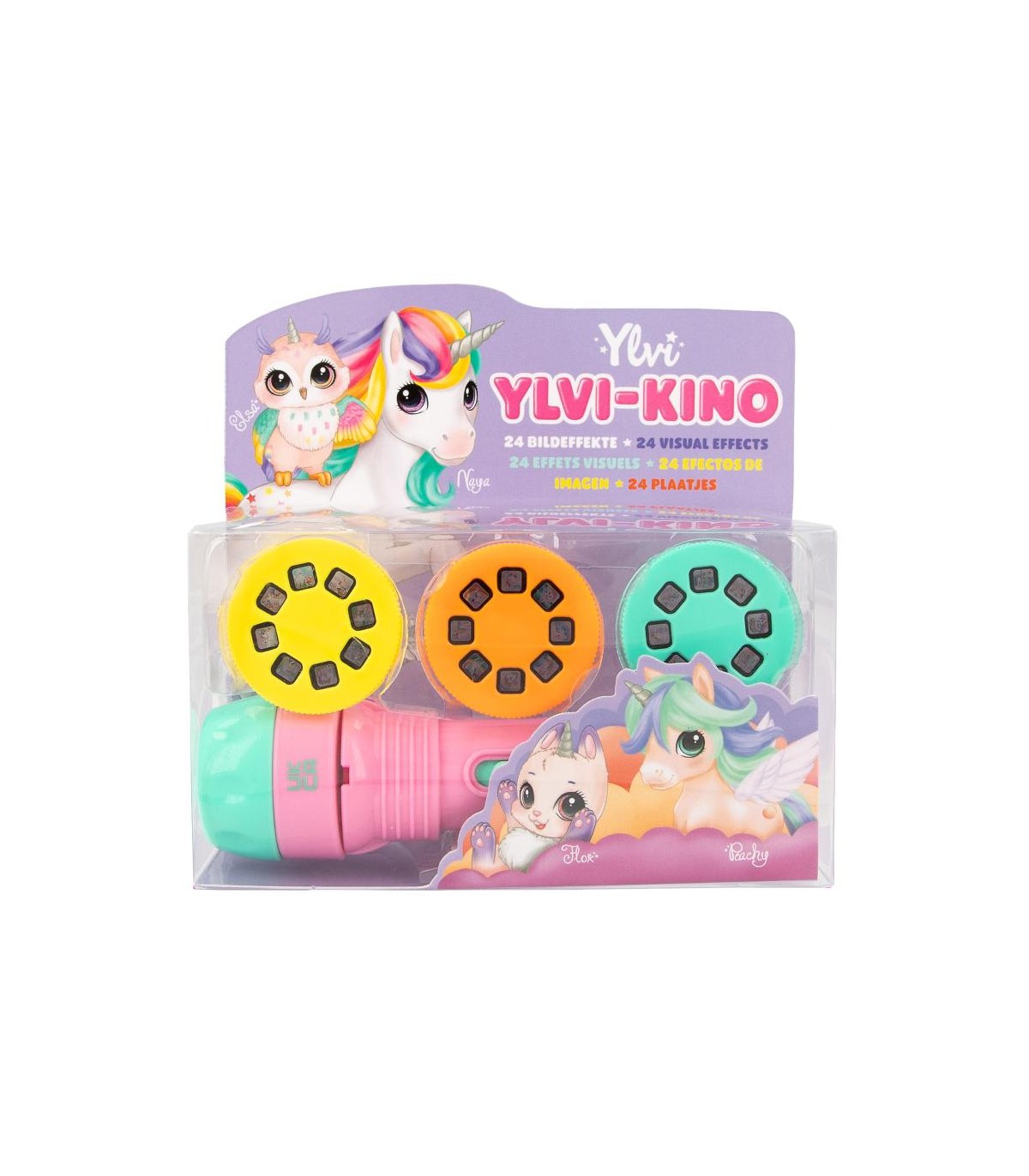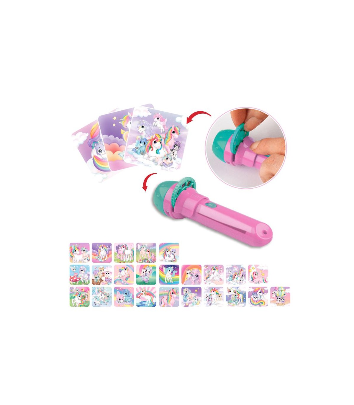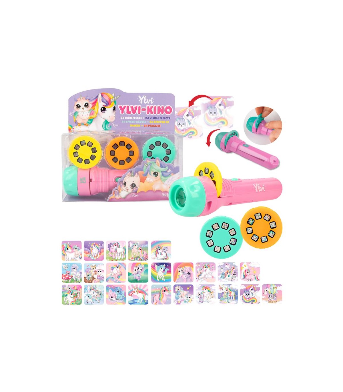 Momentos mágicos de unicornios con Ylvi. Esta linterna rosa con elementos turquesa es a la vez un pequeño proyector. Se pueden insertar tres discos con imágenes distintas que permiten proyectar un total de 24 maravillosos motivos de unicornios. Pilas recambiables incluidas (3 pilas de botón LR44).