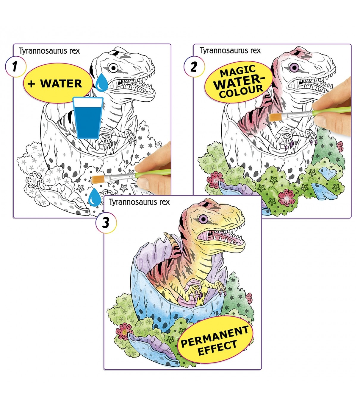Megachulo y megamágico, ¡así es el cuaderno Watercolour Book de Dino World! Solo hay que humedecer el pincel incluido y pasarlo por cualquiera de las 15 fantásticas escenas prehistóricas para que aparezcan sus colores como por arte de magia. ¡Es muy sencillo divertirse pintando y el resultado es grandioso!