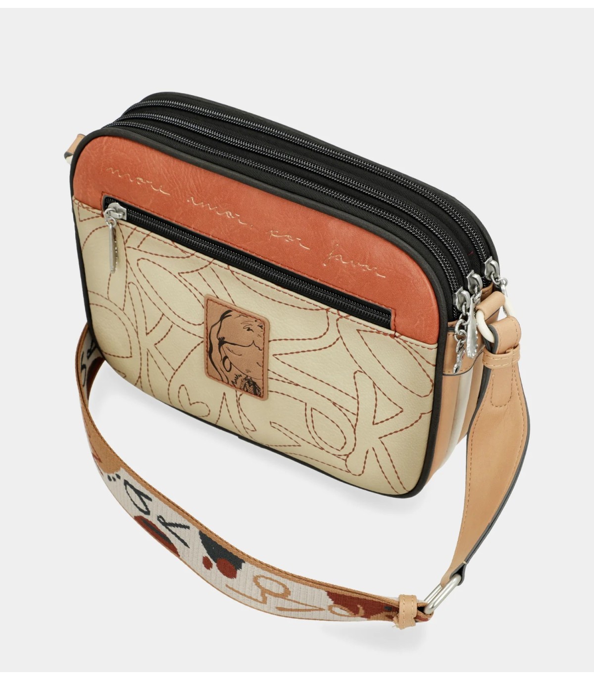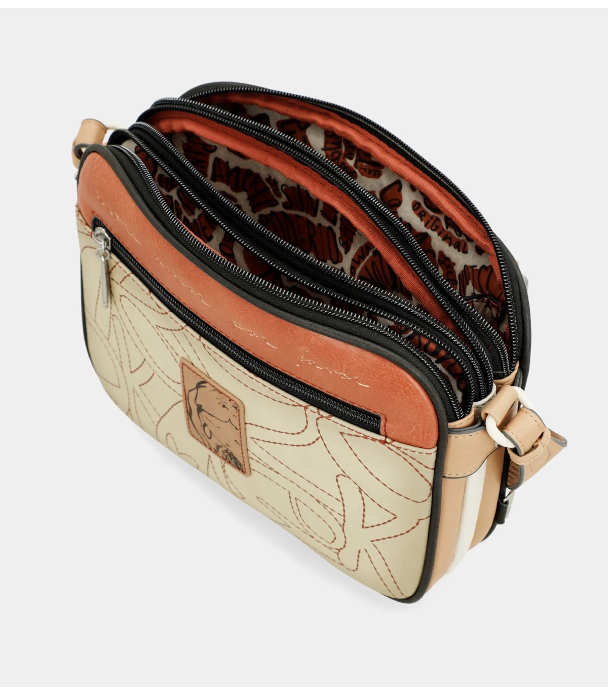 Esta bandolera de tamaño medio cuenta con 3 compartimentos independientes, todos con cierre de cremallera. El interior es forrado y cuenta también con bolsillos. A la hora de colgarlo cuenta con un asa bandolera regulable a diferente largo.