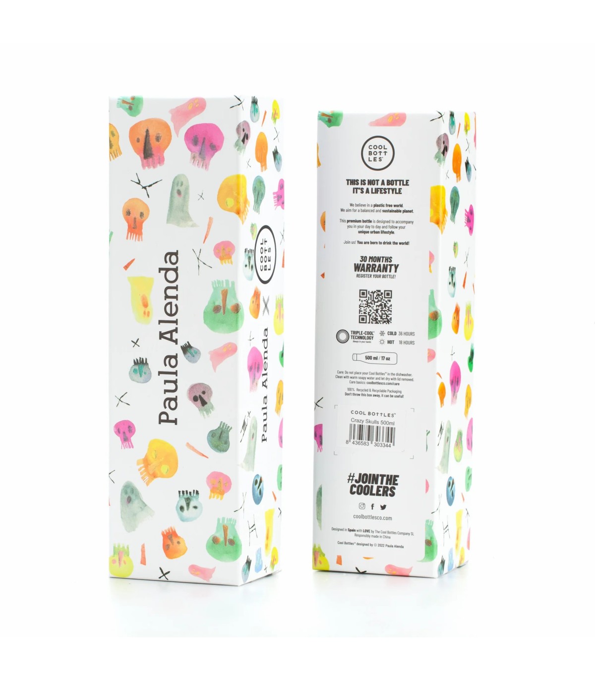 Paula Alenda es una diseñadora alicantina que se ha especializado en ilustraciones para literatura infantil. Tiene un estilo caracterizado por el uso de tonos pastel en figuras delicadas creadas en acuarela. La colección que Paula ha creado para Xclusive! de Cool Bottles es la continuación en formato de 500 ml. de dos de los diseños de la serie Pals de la colección kids. Crazy Skulls es una fantasía terrorífica llena de color.