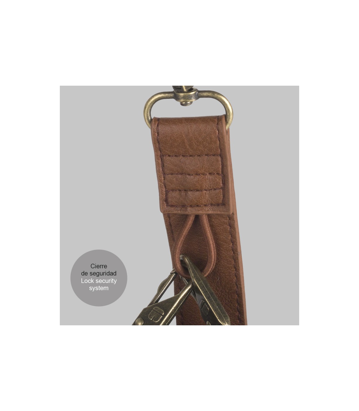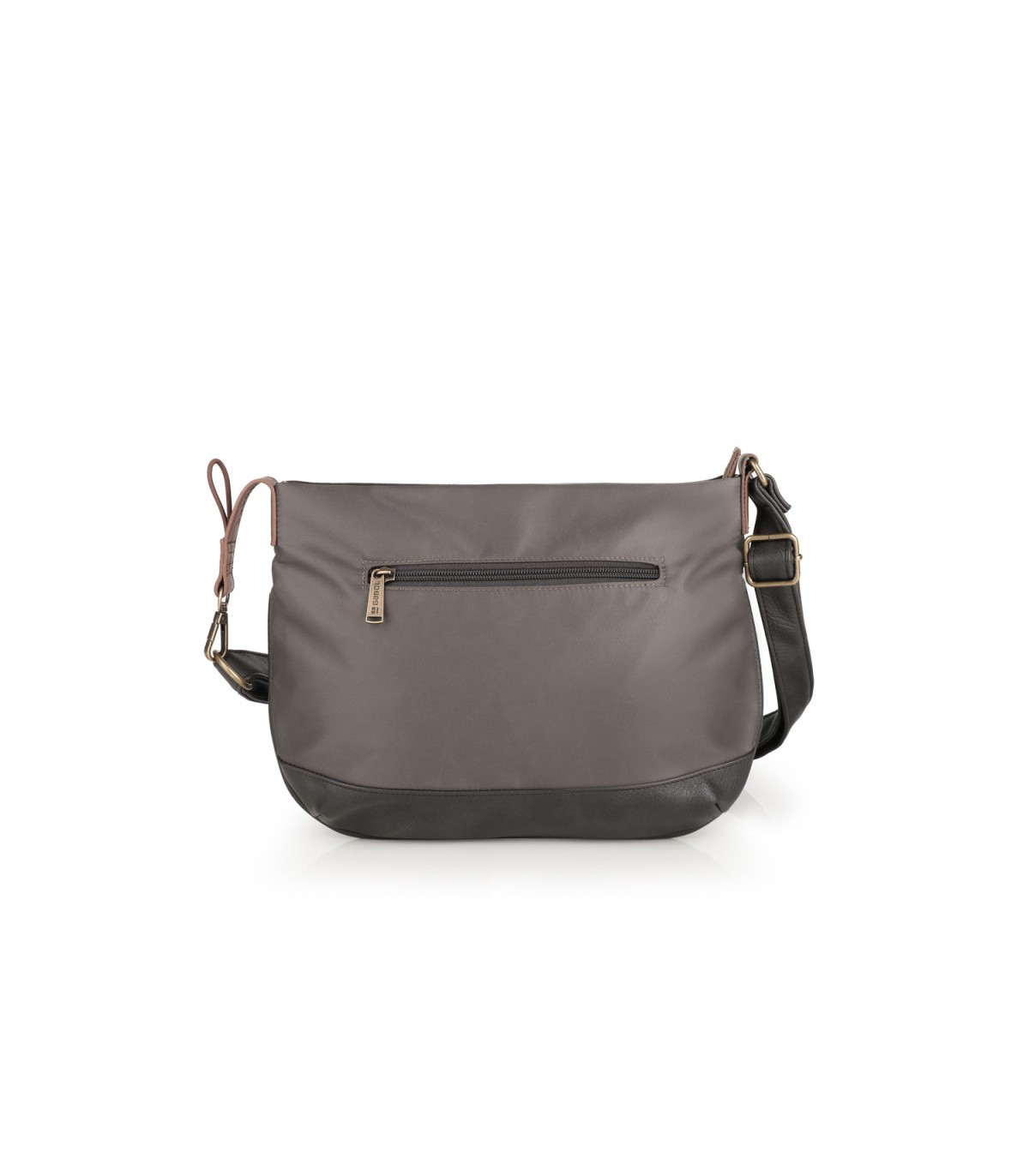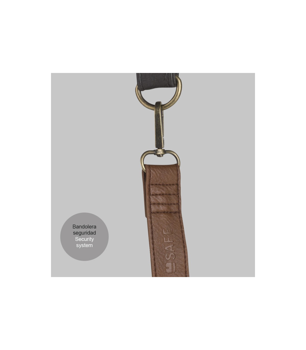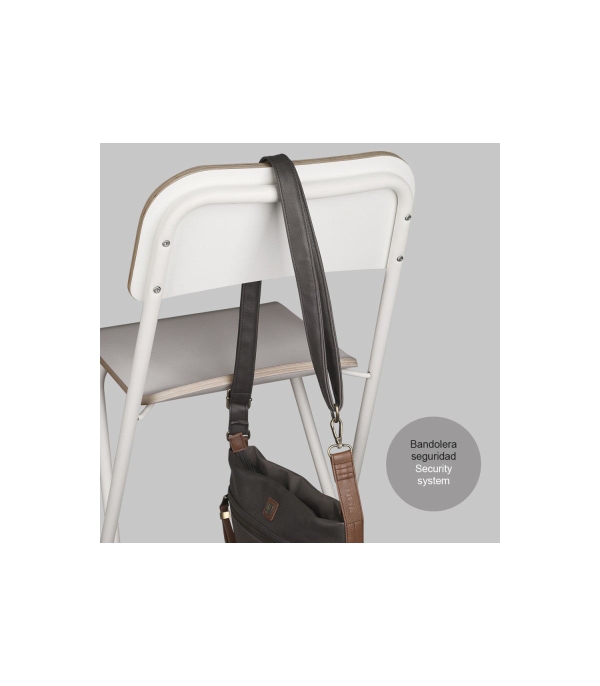 Bolso bandolera de piel sintética y Nylon, taupe, resistente al agua. Fabricado con materiales libres de PVC. Incluye bandolera de seguridad. Con ella podrás enganchar la correa para evitar hurtos.