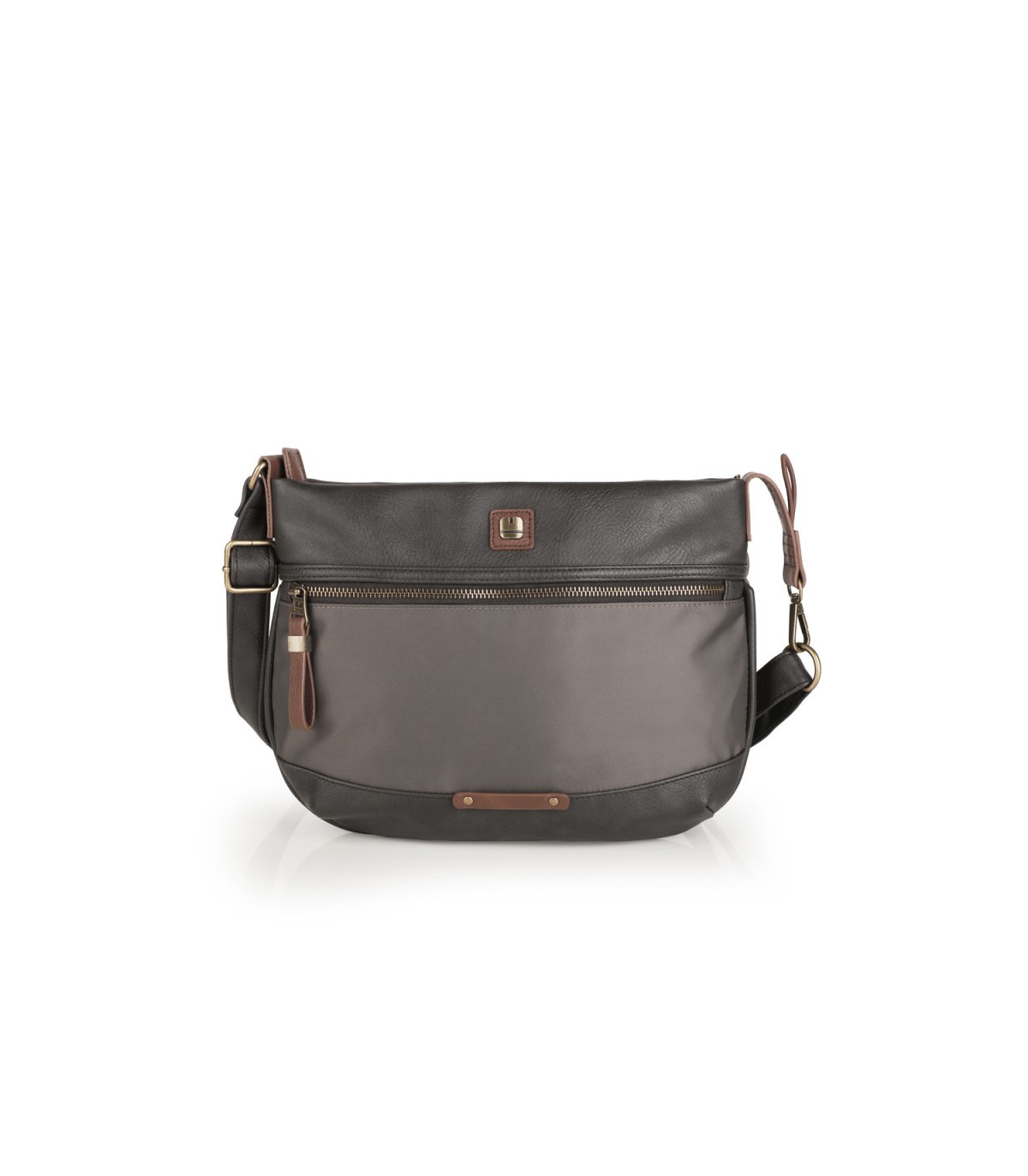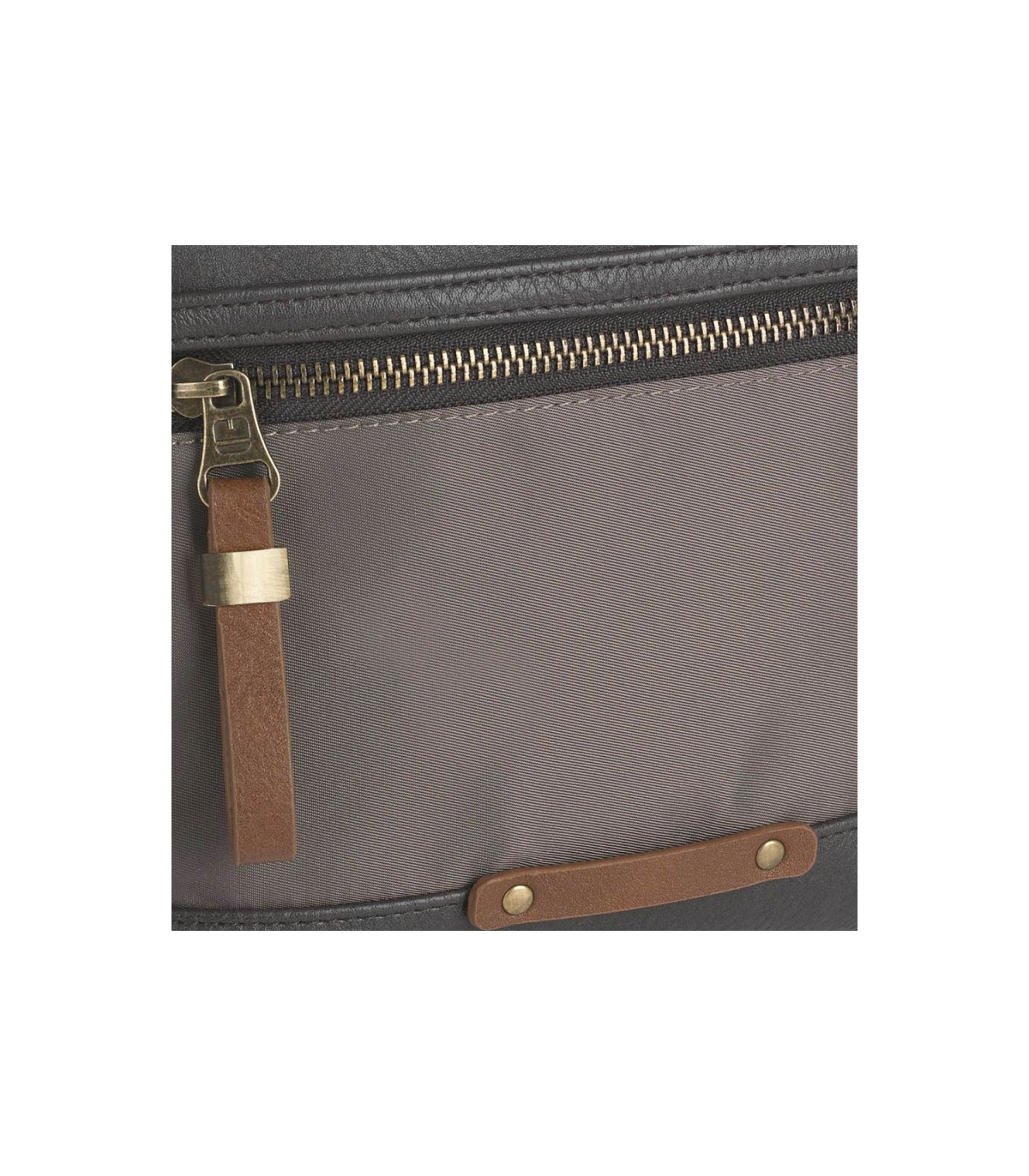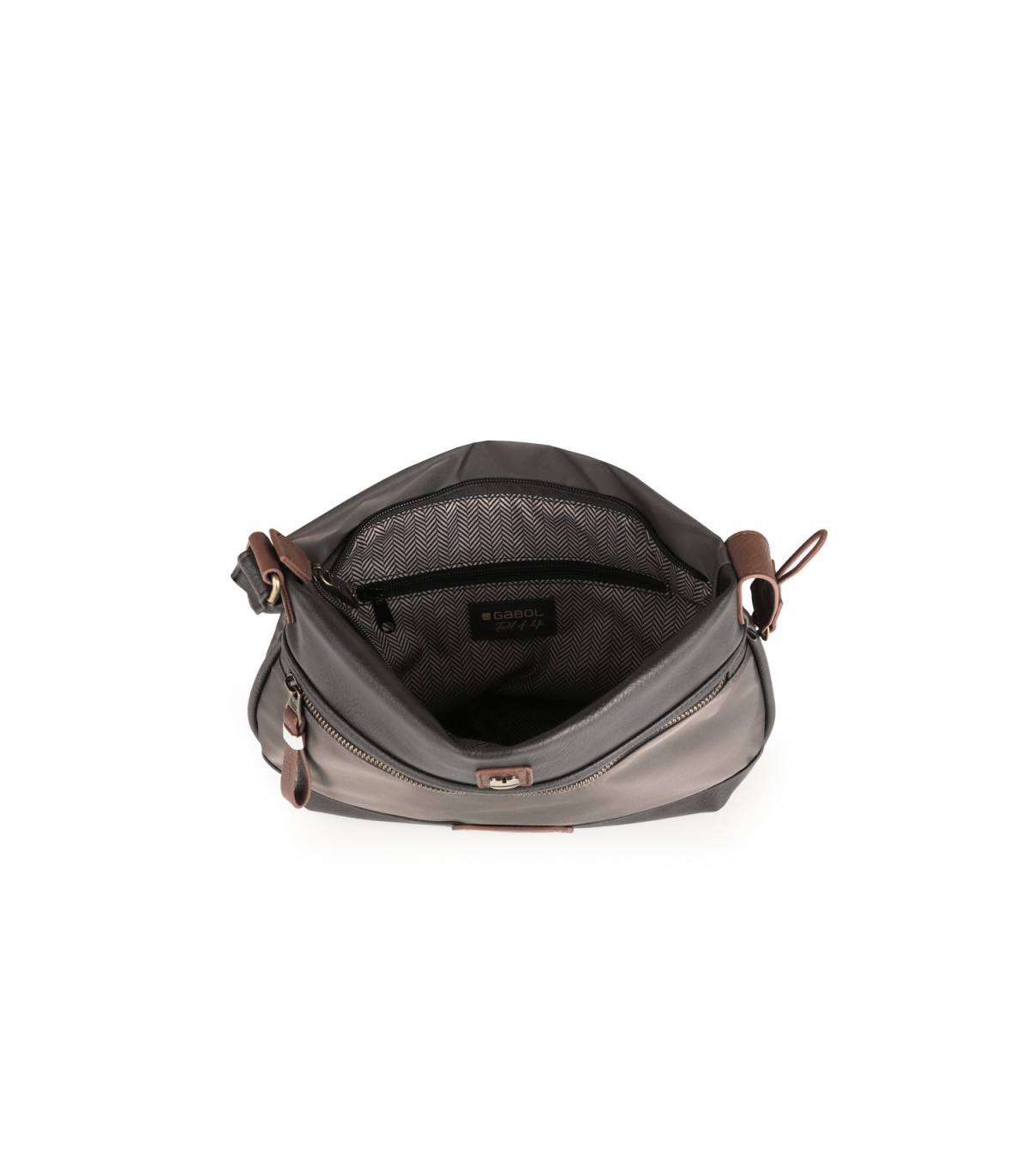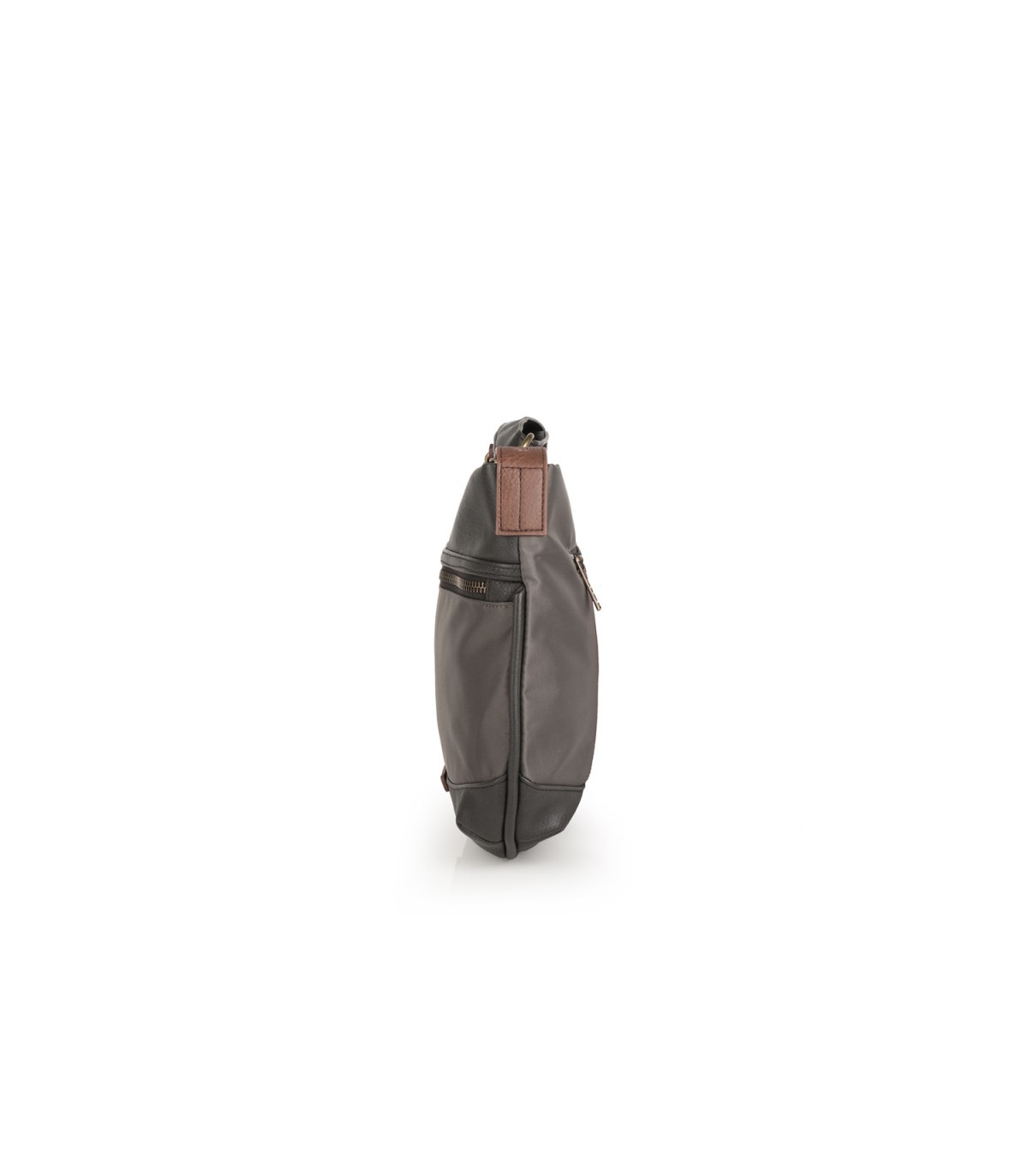 Bolso bandolera de piel sintética y Nylon, taupe, resistente al agua. Fabricado con materiales libres de PVC. Incluye bandolera de seguridad. Con ella podrás enganchar la correa para evitar hurtos.