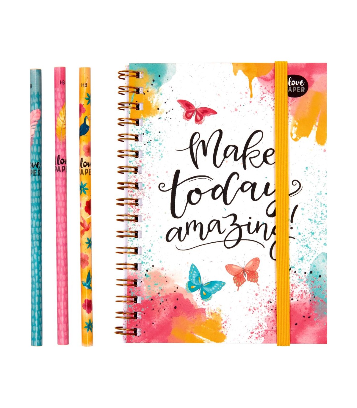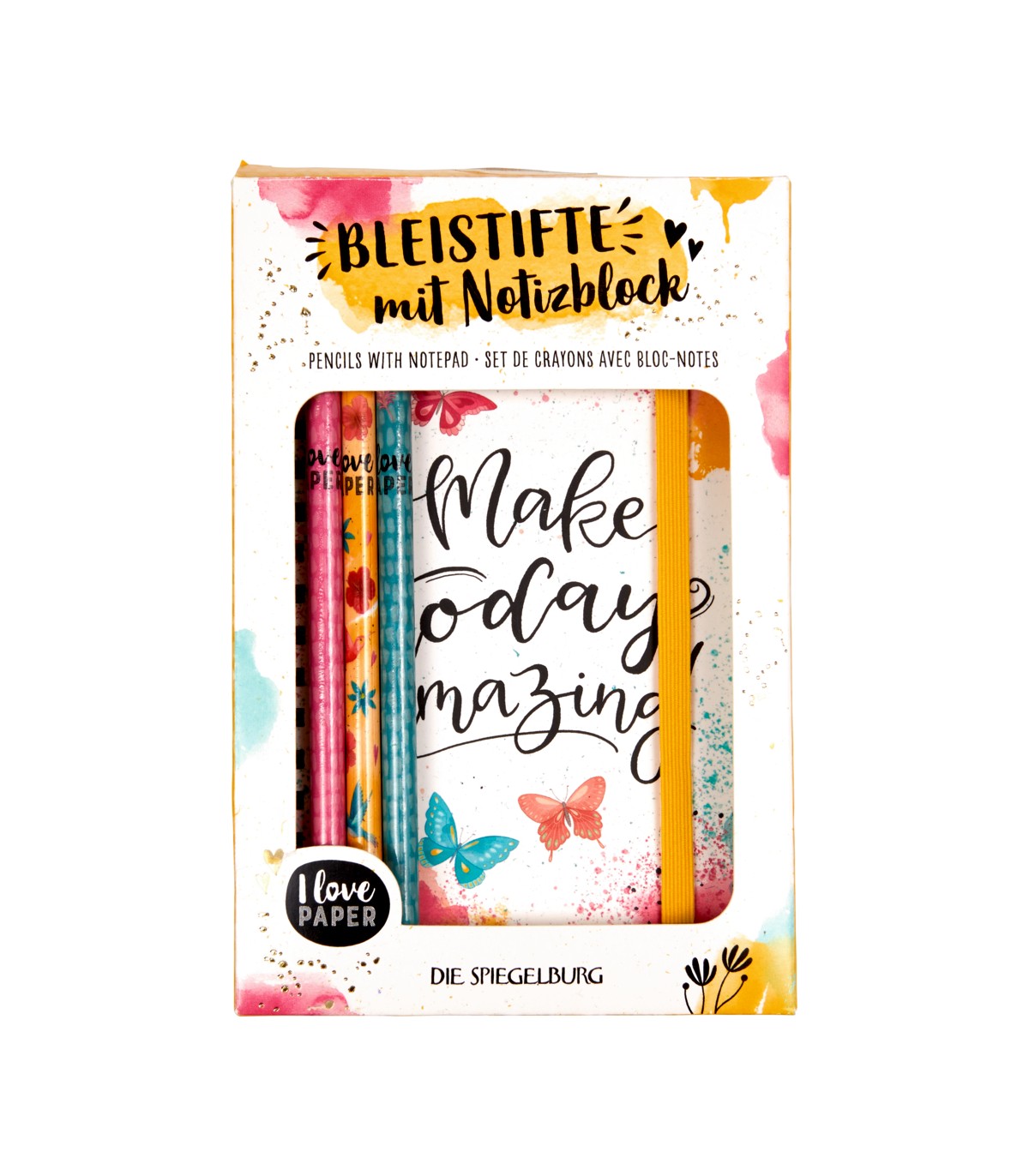 Juego de 3 lápices con mina HB y un bloc de notas (40 p.) empaquetado mágicamente con forma de espiral dorada. Ideal como pequeño regalo o para tu propio escritorio.